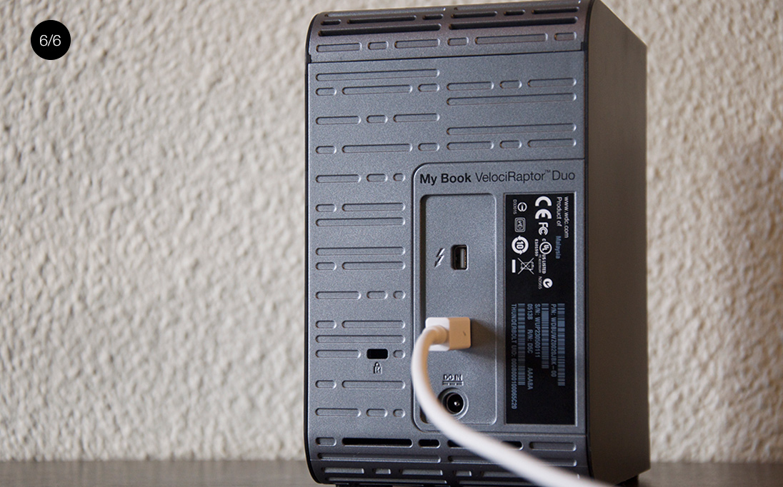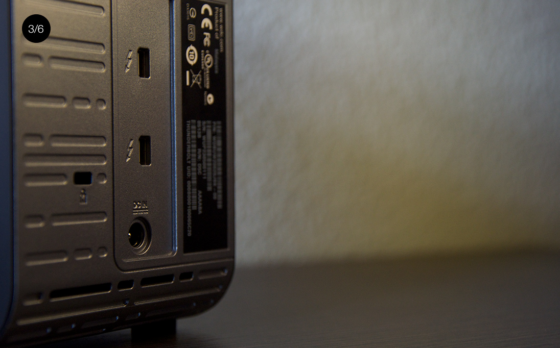 Todavía son unos datos algo más lentos que a lo que nos tienen acostumbrados los SSDs más modernos, pero son unas velocidades que compiten de tú a tú con estos discos. Es tal la velocidad que alcanzan que son una grandísima alternativa a los SSD para aquellos que prefieran sacrificar un poco de velocidad por conseguir un mayor almacenamiento (un disco SSD de 1tb cuesta sobre los 600€ mientras que estos discos cuestan 250€). Toda esta velocidad de escritura y lectura se conecta a nuestro Mac gracias a la tecnología de E/S más avanzada del mercado: Thunderbolt. Aunque por velocidad de los discos daría igual (funcionaría a la misma velocidad) si este equipo se conectase a nuestro Mac por Thunderbolt o por USB 3.0: Con 350mb/s de media en lectura y escritura se queda lejos de los 5gb/s que permite USB 3.0 y aún más lejos de los 10gb/s que permite Thunderbolt. Sin embargo, el hecho de que la tecnología elegida sea Thunderbolt trae consigo ciertas mejoras como la posibilidad de encadenar (de forma similar a lo que sucedía con FireWire) hasta 6 dispositivos para después conectar un único cable a nuestro ordenador, es por eso que el Velociraptor Duo cuenta en su parte trasera con dos conexiones Thunderbolt. En la práctica esto se traduce en que por ejemplo, si como me ha ocurrido a mí, tu ordenador solo tiene un puerto Thunderbolt y lo utilizas para conectar el adaptador a VGA que conecta tu Mac a la pantalla, puedes conectar el disco duro al Mac y después el adaptador VGA al disco duro y todo funcionará como si estuviese conectado directamente al ordenador. Es algo muy simple que nos evita recurrir a un HUB para ampliar la cantidad de puertos.