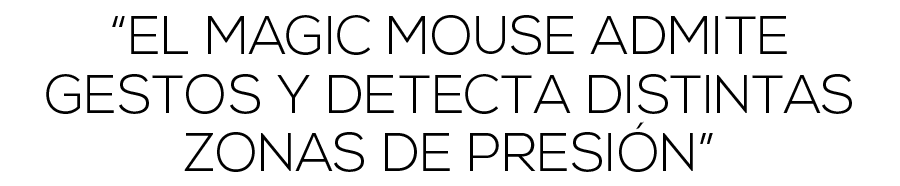 Cuando ves el Magic Mouse por primera vez sueles pensar dos cosas, "¿Pero esto qué es?" y "¡Qué bonito!". También notas la ausencia de botones y de rueda. Pues bien, eso no importa, ya que tienes delante un ratón multitáctil. Este maravilloso roedor inalámbrico usa la misma tecnología que usan los dispositivos iOS, lo que significa que admite gestos y detecta distintas zonas de presión. Por ejemplo, si quieres hacer clic secundario, te pensarás que sin botones no puedes hacerlo. Pues no, porque el ratón sabe en qué zona estás pulsando e interpretará esa información para hacer lo que se supone que debe hacer.