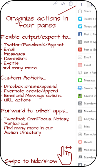 Drafts es el compañero ideal para guardar esas notas con carácter de borrador que vas a utilizar recurrentemente. Textos predefinidos que quizá escribes repetidas veces puedes almacenarlos en Drafts con vistas a compartirlos en servicios de terceros. Sin duda una opción muy interesante.