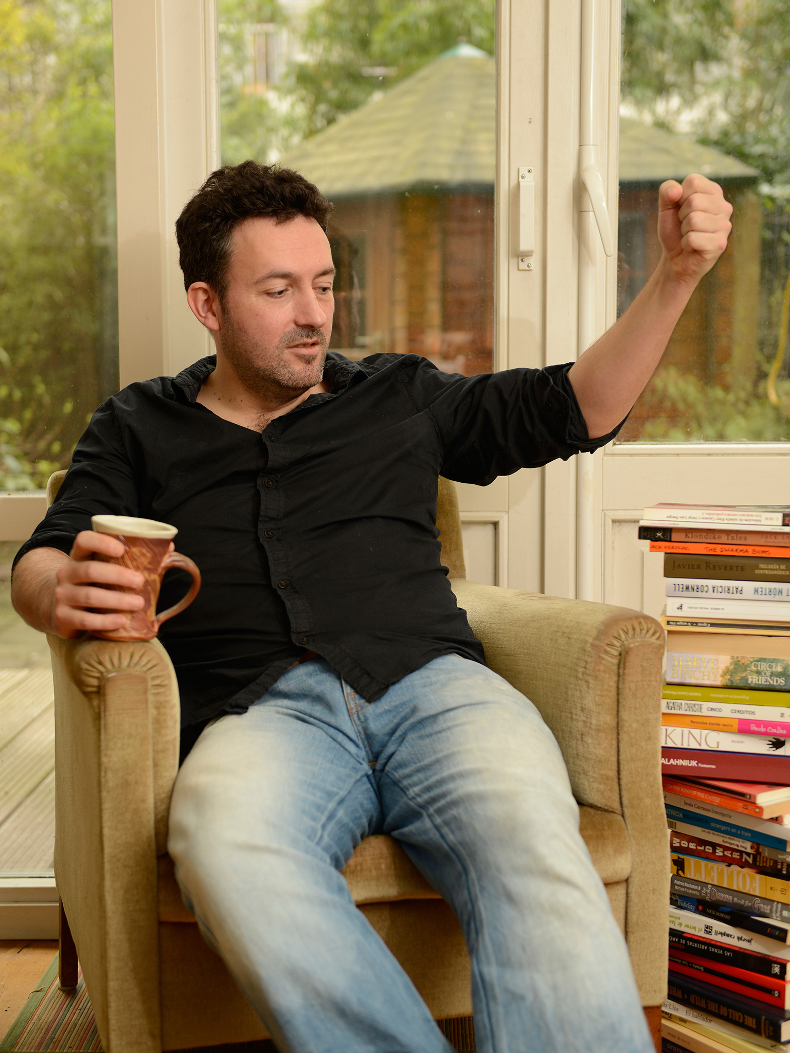 Pasó por accidente, mientras no miraba”. Así nos define su éxito. Llegamos a su casa de Amsterdam y nos recibe con su característico ingenio y sentido del humor. Para las fotos se sienta en su sillón, coge una taza de café y coloca al lado un montón de libros –obras que le han inspirado y que además ha visto desde el retrovisor durante semanas en las listas de ventas–. Es una de esas personas con las que apetece pasar un rato y simplemente escucharle. Sus libros han estado en las primeras posiciones de iBookstore y Barnes & Noble, aunque él curiosamente no se gana la vida escribiendo historias, sino escribiendo código. Conozcamos la Historia de Mikel Santiago.