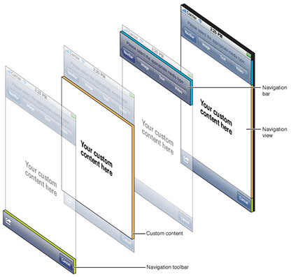 Una barra horizontal en la parte superior, botones, y al pulsar uno de los botones el usuario cambia de pantalla, este objeto lleva encapsulado un botón de regreso, por lo que el desarrollador puede programar el cambio de vista, pero el botón de regreso ya lo tiene implementado el propio Navigation.