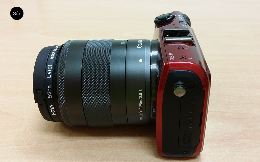 El tamaño, como de costumbre en estas cámaras, es bastante compacto y comedido sobre todo si lo comparamos con las réflex tradicionales. El peso del cuerpo es de 298 gramos, como un iPad mini, por lo que nos sentiremos muy cómodos con ella en la mano. Sin embargo, si nuestro objetivo es el 18-55mm que viene en algunos kits el peso sube hasta más de 600 gramos, unos 200 gramos más que el iPad Air, y la cámara deja de sentirse cómoda en la mano; en el día a día notamos como el peso del objetivo hace que la cámara se nos balancee hacia delante. También perdemos parte de la portabilidad tan característica en estas cámaras, por lo que si no nos importa prescindir del zoom es una opción más recomendable acompañar a la Canon M con el objetivo tipo pancake de 22mm de la marca.