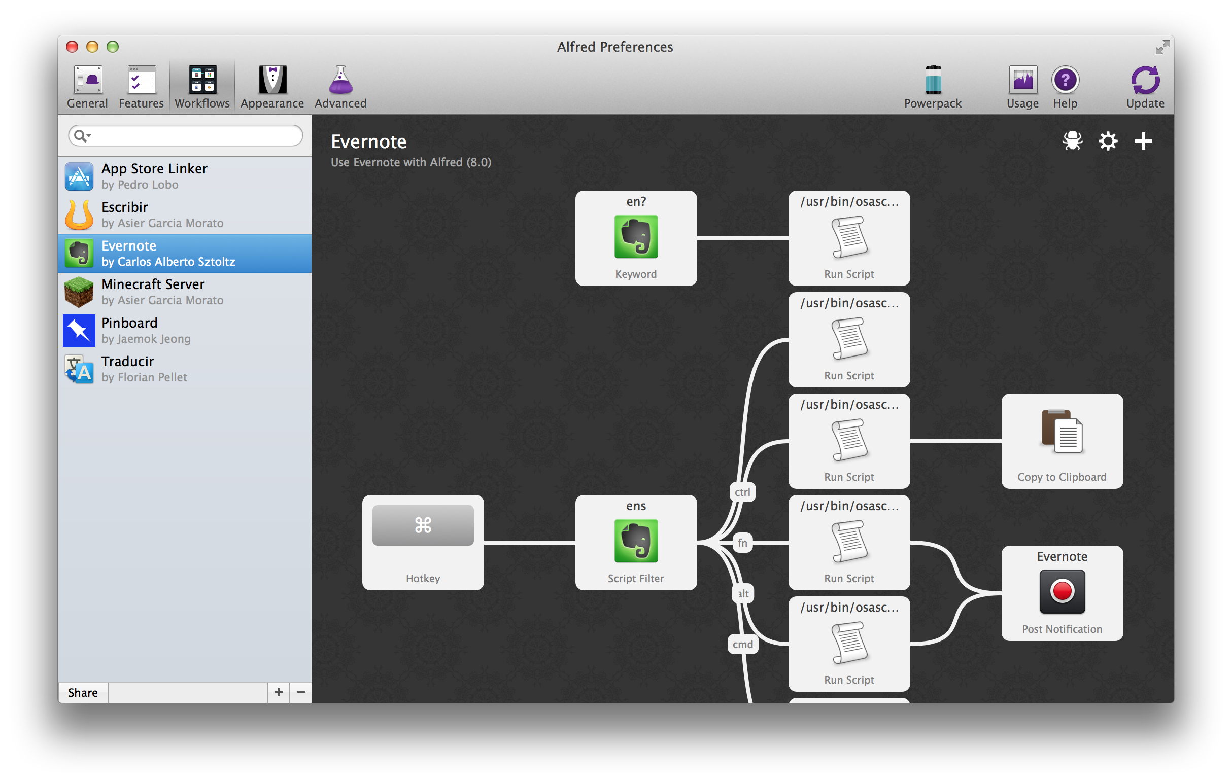 Gracias a este flujo de trabajo podemos buscar, abrir o crear notas desde la propia ventana del lanzador. También podemos añadir información al final de cualquier nota, por lo que ningún pensamiento se nos va a perder por el camino. Personalmente es una de las funciones que más ha cambiado la forma en la que utilizo mi Mac, puesto que desde que la tengo Evernote se ha convertido en una pieza aún más imprescindible. De todos los workflows que he probado, es sin duda alguna el flujo más elaborado que se ha creado hasta el momento para esta app.