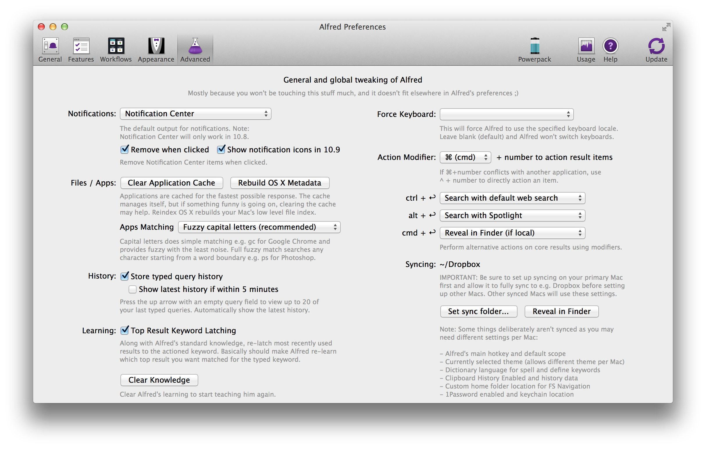 Con una interfaz principal pensada para ser simple y veloz, todos los ajustes y controles tienen que pasar a la ventana de Preferencias, la cual es un curioso contrapunto a lo que nos tienen acostumbrados la mayoría de aplicaciones. Si bien la mayoría deja para el panel de Preferencias la menor cantidad de opciones posibles, en Alfred todos los ajustes se han volcado a esta pantalla. Esto hace que las preferencias cobren especial relevancia y una estética similar a lo que nos encontramos en las ventanas principales de otras apps. Como he dicho, es desde esta pantalla desde donde podemos configurar los distintos aspectos como el atajo de teclado, la apariencia o los flujos de trabajo, todo de forma intuitiva.