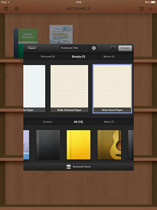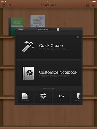 Una vez instalada y abierta la aplicación encontramos el stand donde se almacenarán nuestras notas y el lugar donde hallaremos algunos documentos de ejemplo. Sin embargo si queremos empezar a usar la app de inmediato lo mejor es que pulsemos en el símbolo + de arriba a la derecha para diseñar la base sobre la que trabajar. Aquí encontramos las primeras genialidades, no solo podemos definir un cuaderno nosotros, con su tapa personalizada, sino que si pulsamos en Quick Create tendremos el primer bloc de notas creado sin más líos. Otra de las curiosidades es que desde esta misma ventana podemos importar una libreta o documento que tengamos en alguno de los servicios de almacenamiento en la nube como puede ser box o Dropbox o hasta desde el Carrete y iTunes.