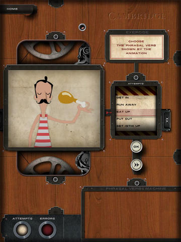 Esta curiosa aplicación desarrollada por la universidad de Cambridge te ayudará a aprender los “temidos” phrasal verbs ingleses de una forma muy particular: cuenta con una interfaz con estética steampunk, es decir, que parece hecha con maquinaria del siglo XIX y principios de siglo XX. Cada verbo contiene un ejemplo gráfico divertido y fácilmente entendible. La aplicación es gratuita.