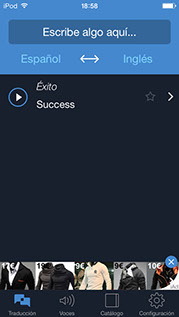 Este traductor bien pudiera ser muy parecido al anterior, pero añade un libro de oraciones comunes en diferentes áreas traducidas profesionalmente que no requiere conexión a internet. Puede tener multitud de voces mediante compras in-app. Su interfaz es algo más convencional, pero no por ello es mala, es bastante buena y clara. La aplicación es gratis y cuenta con compras in-app.