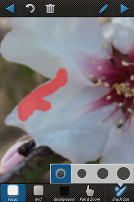 Podemos hacer zoom sobre el objeto y repasar, con diferentes tamaños de brocha, todos los detalles para que no nos dejemos nada sin marcar. Una vez que lo hayamos conseguido ese objeto será el que aparezca enfocado y el resto de la imagen estará desenfocado. La flecha de la parte superior derecha nos indica que podemos continuar.