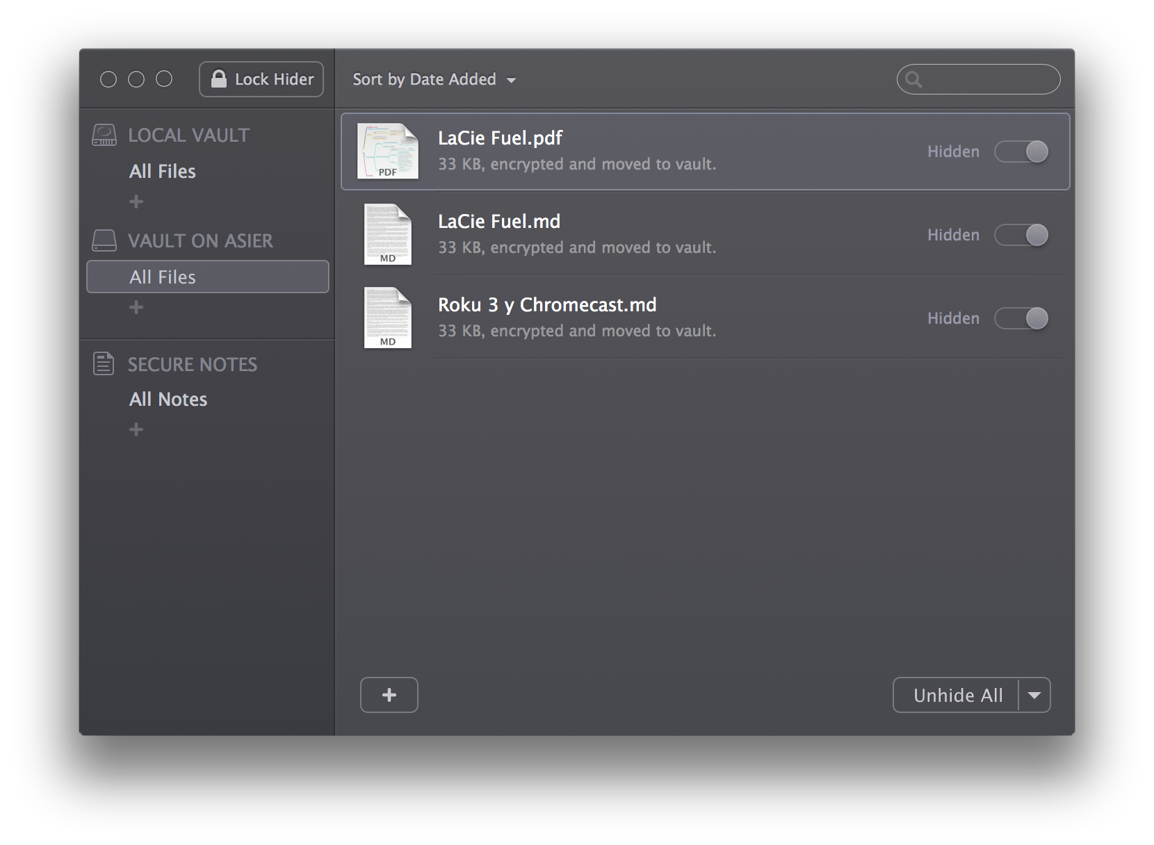 Es en esta interfaz principal donde nos encontramos con los archivos y notas que vamos a ocultar y encriptar. Si bien las notas no tienen mucho misterio, funcionan de forma similar a la función de notas de 1Password, la forma en la que trabaja con los archivos sí es algo particular. Para proteger cualquier archivo, simplemente tenemos que arrastrarlo sobre la interfaz de la app y ésta se encargará de mover dicho documento a su base de datos encriptada cuando éste se encuentre oculto y de volverlo a dejar en su lugar de origen cuando lo saquemos de la caja fuerte. De este modo podemos seguir trabajando con nuestros archivos en el lugar que les corresponde en el Finder, al mismo tiempo que cuando queramos se oculten a la vista de cualquier curioso.