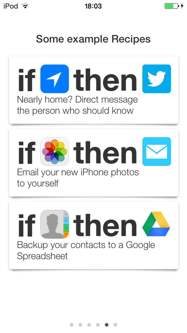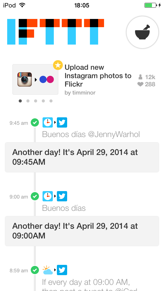 En este mes hablaremos de la App para iOS de IFTTT, un servicio que nos abrirá todo un universo de acciones condicionadas. IFTTT significa If This Then That (Si esto entonces eso), lo que ya te da una pista de para qué sirve. Imagínate que quieres que cada día a las 9 de la mañana quieres que se publique un tweet desde tu cuenta de Twitter, o que cada vez que haya cambios en tus archivos de dropbox se te notifique con un mensaje. Tan sólo debes programarlo en IFTTT. Y no te preocupes, no es para nada difícil, no necesitas conocimientos de programación ni nada por el estilo. Pasemos a ver cómo funciona todo esto.