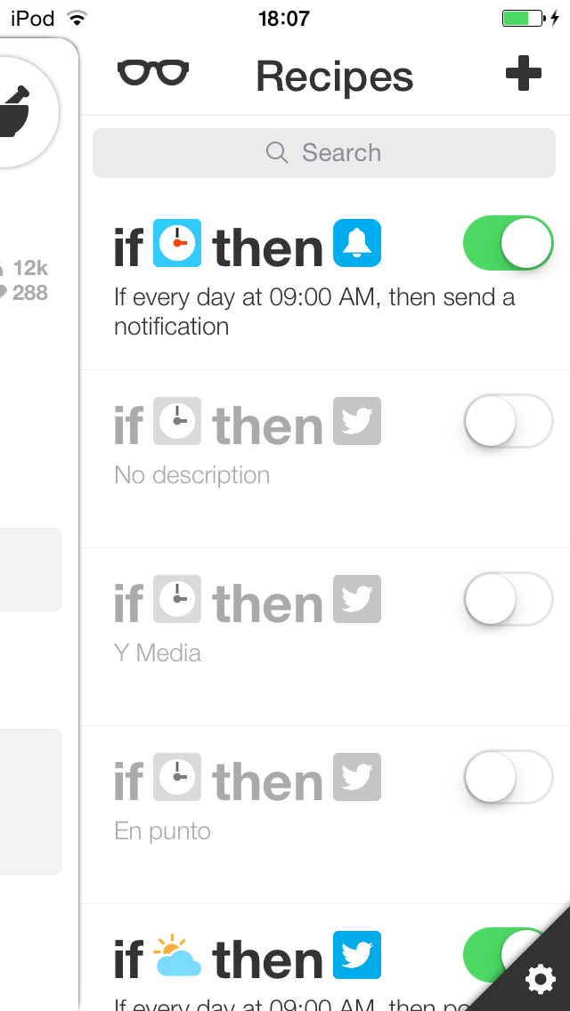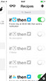 Empecemos con la App. Nada más abrirla te mostrará un pequeño tutorial en el que te enseñará lo básico para que entiendas el concepto en el que se basa IFTTT para funcionar, las acciones condicionadas. Una vez pasado el tutorial, podrás crear una cuenta o acceder con tu cuenta en caso de que ya tengas una. Una vez la hayas creado o hayas entrado con tu cuenta, entrarás en la pantalla principal. En ella se te mostrarán las acciones que hayas programado y se hayan realizado, en orden descendiente de más reciente a más antigua. Verás que hay un círculo con un mortero en la parte superior derecha. Si le das aparecerán en un lateral tus “recetas”, que no son más que las acciones que has creado, pero no tienen porqué estar activas. Si pulsas sobre ellas, podrás editarlas.