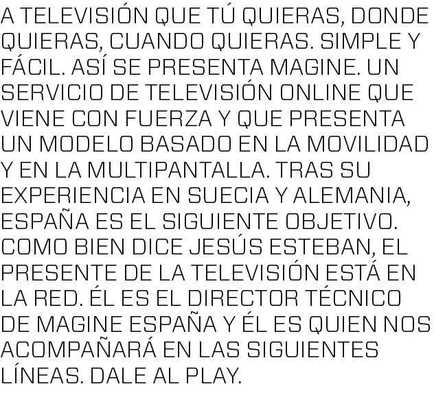 Efectivamente, no es un negocio sencillo, pero confiamos plenamente en nuestra capacidad tecnológica y de negociación. Como prueba de ello podemos señalar el éxito de Magine en Suecia y Alemania. La evolución tecnológica ha reconfigurado el ecosistema de la televisión, tal y como se conocía hasta ahora, lo que ha supuesto un cambio de comportamiento de los usuarios y el desarrollo de nuevos modelos de negocio en los que las empresas de telecomunicaciones juegan un papel importante para acercar los contenidos demandados por el consumidor en cualquier momento, lugar y dispositivo. El futuro de la televisión, o más bien el presente, está en la Red.
