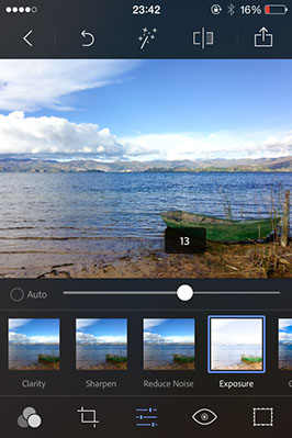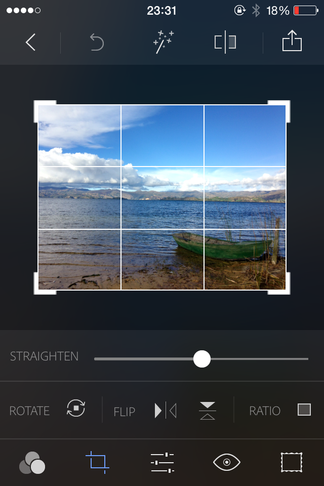 Seleccionamos la imagen desde el carrete del iPhone y vamos a la opción “straighten” para nivelar el horizonte que aparece caído en la fotografía original. Este tipo de detalles pasan muchas veces desapercibidos pero hay que fijarse siempre en los horizontes de las fotografías y conseguir que estén completamente derechos.