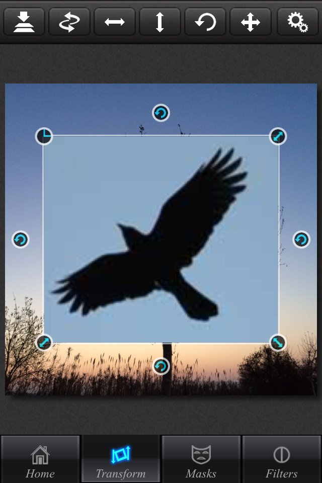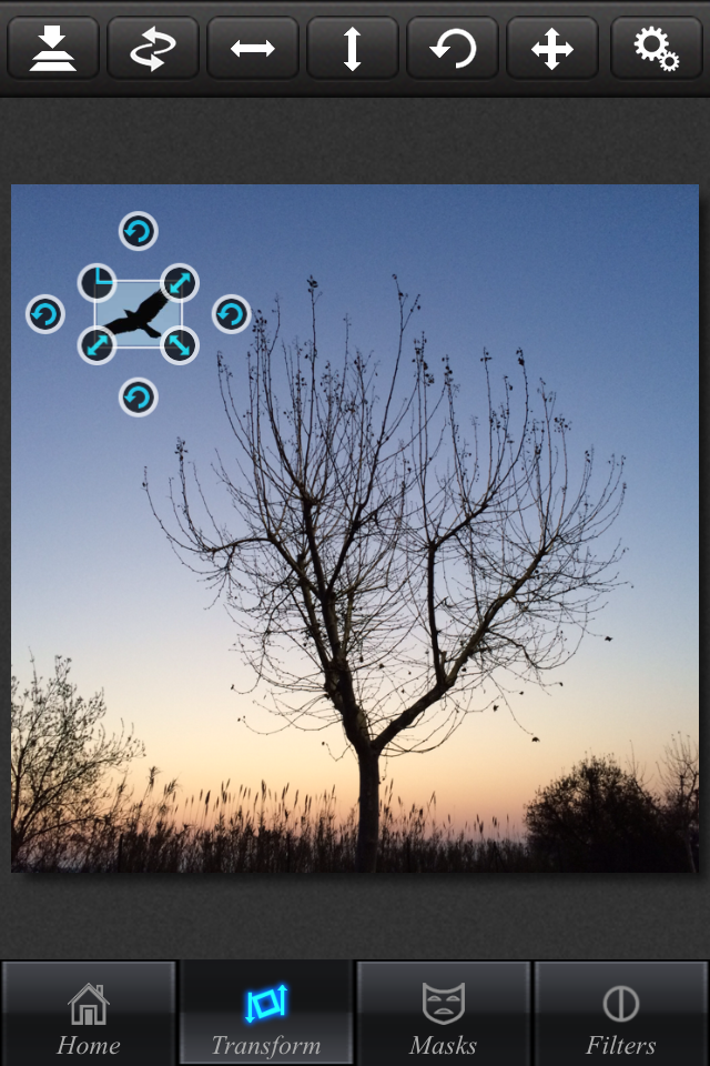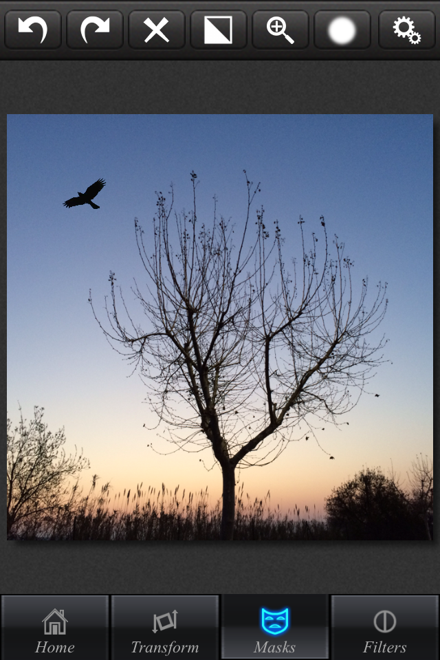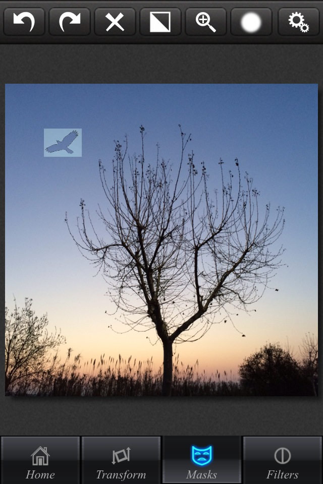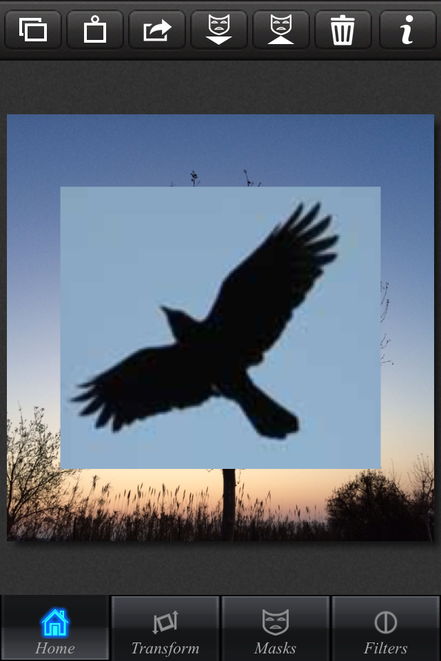 Vamos a hacerla más pequeña y nos iremos a la zona superior izquierda donde la colocaremos, ya reducida de tamaño; la idea es que tenga sensación de realidad y añadir algo más a la imagen que tenemos. Una vez colocada la figura del pájaro iremos a la opción “Masks” y tocaremos la figura quedando sólo la silueta sin el color negro. Le daremos a la opción “invert” de la parte superior de la pantalla con forma de cuadrado y nos quedará la silueta limpia de fondo.