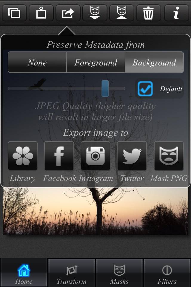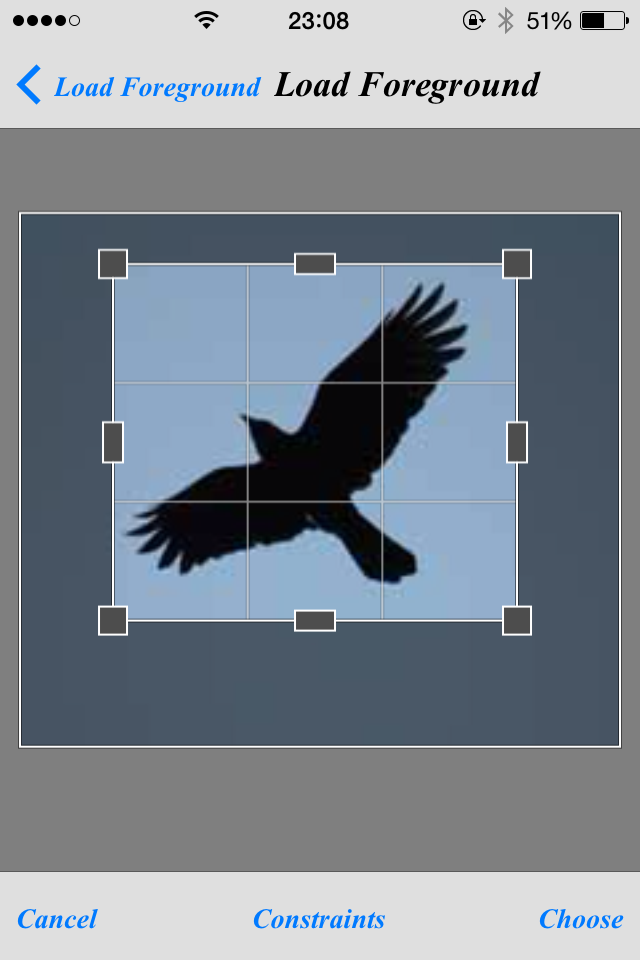 Seleccionamos la fotografía del lector como “Background”. Como “Foreground” hemos buscado una imagen de una silueta de un pájaro que podemos conseguir bien fotografiándola o bien obteniéndola a través de internet y la recortamos para centrarnos sólo en la figura. Una vez que ya la hemos recortado nos aparece sobre la imagen de fondo de nuestro lector. La opción “transform” nos permite modificar el tamaño de la imagen y girarla si lo precisamos.