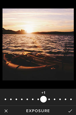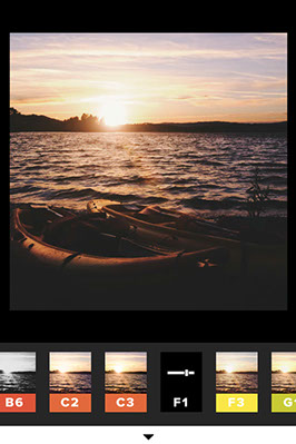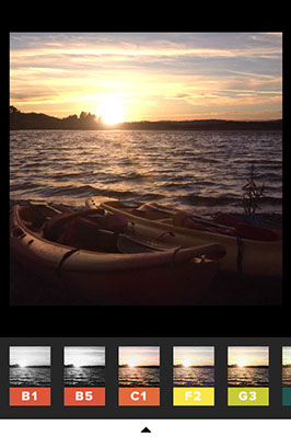 Seleccionaremos el “F1” porque es el que nos ha convencido para este atardecer y luego podemos editarlo a su vez con las herramientas que nos facilita la aplicación: exposición, contraste, saturación, etc., que de una manera sencilla, nos hace mejorar los diseños predefinidos.