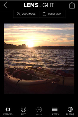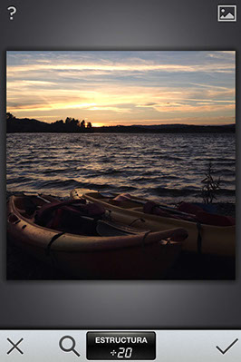 En esta ocasión utilizaremos Snapseed para darle nitidez y estructura a la fotografía entrando en el menú “Details”; “25” nitidez y “20” estructura. Guardamos en nuestro carrete. Nos vamos a la siguiente de las aplicaciones, la conocida “Lens Light” (foto 6). Seleccionamos nuestra fotografía del carrete y nos vamos a “Effects” - “LensFlares” y seleccionamos el “Sol Invictus” para colocarlo en el lugar donde el sol se ha escondido casi por completo.
