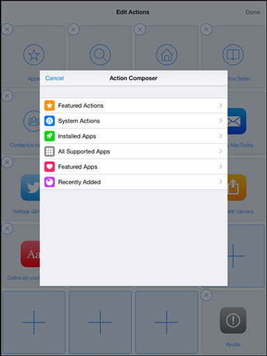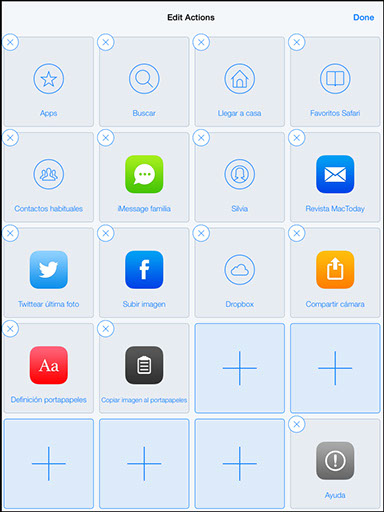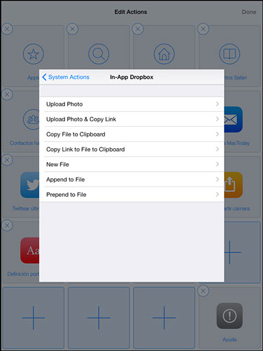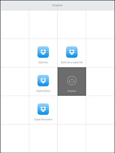 Una vez la hayas instalado, podrás apreciar que su interfaz encaja a la perfección con iOS 7, el más reciente sistema operativo de la compañía de la manzana, y es que el diseño de la misma es bastante simple y minimalista. Nada más abrirla, podrás observar una cuadrícula dividida en veinte secciones distintas (quince en la versión para iPhone), dentro de las cuales podrás ubicar distintas acciones o grupos de acciones, los dos elementos principales en los que se basa esta aplicación. Para comprender mejor el funcionamiento de esta app, vamos a verlo con un ejemplo. Imagina que acabas de hacer una foto con tu iPad y quieres subirla a Dropbox para compartirla con tus contactos. ¿Cómo lo harías? En primer lugar, una vez hecha la foto, tendrías que abrir la aplicación de Dropbox y desde ahí, subir la imagen a tu cuenta. Posteriormente, deberías acceder al menú contextual de la foto y pulsar en la opción “Copiar enlace”. A pesar de que estamos acostumbrados a dar estos pasos de manera inconsciente, si lo pensamos, la velocidad de todo el proceso es mejorable. Imagina que pudieses hacer todo esto únicamente pulsando un botón. Gracias a Launch Center Pro es posible, ya que podríamos crear una acción que, al lanzarla, se encargue de subir de forma automática a tu cuenta de Dropbox la última foto que hayas tomado con tu iPad, además de copiar el enlace a la misma en el portapapeles sin ningún tipo de intervención por parte del usuario. Suena bien, ¿verdad? Y si tienes más de una acción relacionada con esta aplicación, podrías ubicarlas todas dentro de un grupo llamado “Dropbox”. Por ejemplo, podrías crear otra acción que automáticamente copie en el portapapeles el enlace de cualquier archivo que tengas en Dropbox, y otra que se encargue de subir la imagen más reciente, pero esta vez sin copiar el enlace. De este modo, cuando queramos llevar a cabo alguna tarea relacionada con Dropbox, tan solo tendremos que abrir Launch Center Pro y desplazarnos al grupo “Dropbox” para lanzar la acción más conveniente en cada momento.