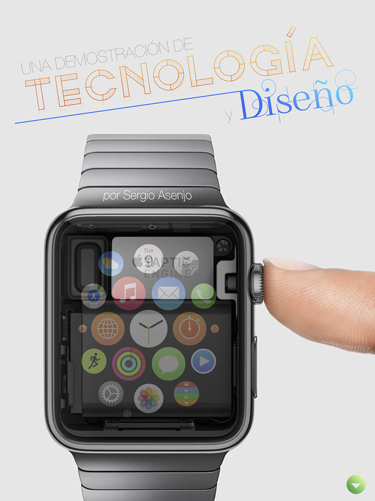 No cabe duda de que el trabajo realizado en cuanto al diseño y al software de este nuevo dispositivo es inmejorable, pero en Apple también se tuvieron que enfrentar a otro problema: ¿cómo controlar la interfaz del Apple Watch? La mayoría de los relojes inteligentes se decantan por emplear la pantalla táctil como principal fuente de entrada de datos. Por el contrario, en Cupertino llegaron a la conclusión de que este método no es el ideal. El motivo es que, al manipular la pantalla con los dedos, estamos perdiendo visibilidad, ya que tapamos el contenido mostrado en la pantalla, por lo que los típicos gestos que utilizamos a diario en nuestros smartphones -como pellizcar la pantalla para alejar una imagen- no tienen sentido en un dispositivo como el Apple Watch. Se fijaron entonces en un elemento que ha estado presente en los relojes de pulsera desde siempre: la corona. Este elemento es la pieza principal que utilizamos para realizar acciones tan cotidianas como poner el reloj en hora o ajustar la fecha del mismo. A partir de este elemento, Apple ha creado lo que ha denominado Corona Digital. Es decir, han utilizado un elemento absolutamente tradicional para controlar una interfaz en miniatura de lo más novedosa. En el Apple Watch, la Corona Digital te permitirá controlar y desplazarte por los menús y la interfaz del dispositivo. Para ello, únicamente hay que girar la corona hacia un lado o hacia otro, tal y como haces con tu reloj tradicional. No solo sirve para desplazarse por los menús, sino que permite ampliar de forma fácil una imagen para ver todos los detalles de la misma, así como hacer zoom en un mapa sin tapar la pantalla con la mano. Además, esta Corona Digital cuenta con una característica heredada del botón Home del iPhone y el iPad, y es la posibilidad de pulsar la misma para volver al menú de inicio, en el que se encuentran todas las aplicaciones.