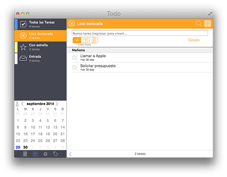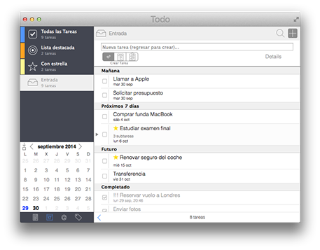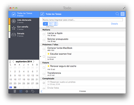 Nada más abrirla, apreciarás la sencillez y el minimalismo de la aplicación, y es que la interfaz de Todo se centra por completo en el contenido, facilitando que de un rápido vistazo puedas ver qué es lo que tienes que hacer durante el día. En la parte izquierda de la misma podrás acceder a las secciones más importantes de Todo, gracias a las listas inteligentes incorporadas. Las más interesantes son “Todas las tareas”, donde se muestran todas y cada una de las tareas que hayas indicado, así como la “Lista destacada”, donde aparecen solo las tareas que tienes que hacer entre el día de hoy y mañana, para que no te distraigas con eventos posteriores. Otra que podría resultarte útil es la lista “Con estrella”, ya que te permitirá localizar de un rápido vistazo las tareas que previamente hayas marcado con una estrella, algo que podría servir para encontrar rápidamente las más importantes.