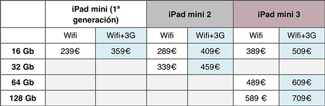 La capacidad va a ser, junto con el dinero, el motivo de decisión. Cook y su gente han tomado la misma determinación que con los últimos iPhones y han eliminado la (para mí) ideal capacidad de 32 Gb en sus últimos tablets, lo cual aún deja como mejor opción un iPad mini 2 de 32 Gb, que aún resulta algo más económico que el 3 de 16 Gb. Capacidad ésta, por cierto, descartada para mí y creo que para quienes ya tienen contacto previo con iOS, salvo que tengas un autocontrol absoluto y sepas que no almacenarás nada en local, porque ya se encarga el sistema de adjudicarse buena parte del espacio disponible desde el instante cero (unos 6 Gb, en mi última restauración completa).