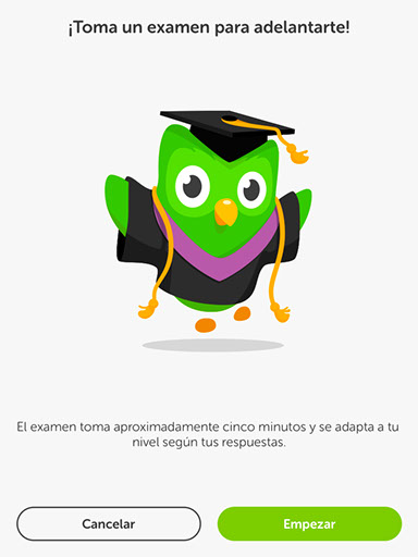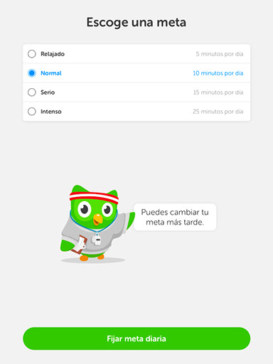 Una vez hayas instalado la aplicación en tu dispositivo, tendrás la posibilidad de crear una nueva cuenta de usuario o de iniciar sesión con una cuenta existente. A continuación, podrás escoger un curso entre la gran cantidad de idiomas disponibles. Tan pronto hayas escogido el idioma que quieras aprender, la aplicación te preguntará tu meta diaria, pudiendo escoger entre el modo Relajado (5 minutos por día), el modo Normal (10 minutos por día), el modo Serio (15 minutos por día) y el modo Intenso (25 minutos por día). Si posteriormente cambias de opinión, podrás modificar esta selección en cualquier momento. Después, la aplicación te preguntará si eres principiante en el idioma seleccionado o si ya tienes algunos conocimientos previos. Si ya sabes algo del idioma que quieres aprender, existe la posibilidad de tomar un examen de nivel de aproximadamente cinco minutos de duración con el que comprobar tu destreza y saltarte algunas unidades temáticas. Este examen incluye distintos tipos de preguntas, como la traducción de frases y pruebas de sonido, y se va adaptando en tiempo real a tu nivel según tus respuestas. Si, por el contrario, no sabes nada del idioma seleccionado, tendrás que empezar desde cero.