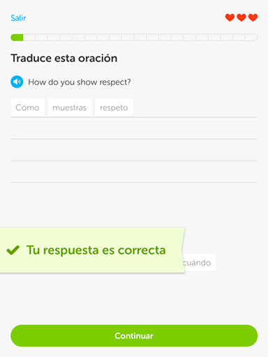 Una vez hayas decidido si haces el examen o no, simplemente tendrás que comenzar a realizar las lecciones que te ofrece Duolingo para ir avanzando a lo largo del temario. Con el objetivo de que puedas aprender un idioma de forma entretenida, la aplicación está enfocada a modo de juego. Por ello, verás que nada más empezar un tema, cuentas con tres vidas que tienes que conservar, ya que de no hacerlo, tendrás que volver a empezar el nivel. Si, por el contrario, terminas el nivel con éxito, escucharás un motivador sonido que te invitará a continuar con el siguiente tema. A pesar de que la aplicación tiene en cuenta todos tus errores a la hora de restarte vidas, también tendrá en cuenta que en ocasiones pueden tratarse de simples descuidos. Por ejemplo, si por error te ha faltado una letra al escribir una palabra (atention en lugar de attention), Duolingo no te penalizará por ello, tan solo te advertirá de que tengas más cuidado la próxima vez. Además, si te piden que traduzcas una frase de español a inglés y, por error, vuelves a escribirla en español, la aplicación no lo contará como un error, sino que te avisará de que estás escribiendo en el idioma equivocado. Otra de las características más interesantes de esta aplicación es que se adapta perfectamente a todo tipo de usuarios, independientemente de su nivel en el idioma escogido, permitiendo incluso seleccionar distintas velocidades en las pruebas de sonido. Son este tipo de detalles los que hacen que la experiencia de usuario de Duolingo sea realmente satisfactoria.