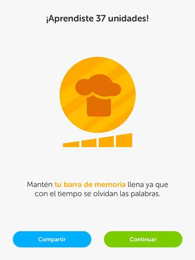 Al finalizar cada nivel, aparecerá un gráfico con tu evolución y los puntos de experiencia adquiridos, algo que resulta de utilidad para ver si estás progresando en el aprendizaje del idioma. Además, para motivar a los usuarios a seguir practicando, tras cada nivel superado obtendrás "lingots" que posteriormente podrás canjear en la tienda virtual de la aplicación a cambio de nuevos niveles y disfraces para el búho, la característica mascota de la aplicación. Además de mostrar un gráfico con tus progresos, Duolingo los tiene en cuenta de forma interna. Por ello, si piensa que es probable que no conozcas una determinada palabra, cuando esta aparezca la mostrará en color amarillo, además de indicarte su traducción y pronunciación. Otra característica interesante es la posibilidad de evaluarte de varias unidades a la vez. De este modo, si en un determinado momento piensas que dispones de los conocimientos necesarios para enfrentarte a una prueba simultánea de varias unidades, podrás realizar un único examen con el objetivo de avanzar más rápido, ya que evitarás tener que realizar un examen de cada sección por separado. Y como toda aplicación moderna, Duolingo cuenta también con una faceta social, ya que en todo momento tendrás la posibilidad de compartir tus avances en las principales redes sociales, como Facebook o Twitter. Además, tendrás la posibilidad de seguir a tus amigos para observar sus avances y tratar de superarlos. A pesar de todas las bondades de la aplicación, esta cuenta con un pequeño error que debería corregirse. En las pruebas de voz (en las cuales tendrás que pronunciar de forma correcta una frase determinada), la aplicación marcará como correcta tu respuesta aunque hayas pronunciado mal la frase. De hecho, incluso si ni siquiera has pronunciado la frase, y únicamente has hecho un ruido o has dado un golpe en el micrófono del dispositivo, la aplicación te felicitará por tu correcta pronunciación. Aún así, a pesar de este fallo, la valoración general de Duolingo sigue siendo excelente.