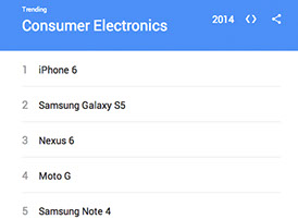 Apple domina en las búsquedas de Google, y más en concreto su iPhone 6, que se queda con el primer puesto en electrónica de consumo. Las siguientes posiciones están ocupadas por Samsung Galaxy S5, Nexus 6, Moto G y Samsung Note 4. el Apple Watch se ha quedado en la octava posición, mientras que el Top 10 lo cierra el iPad Air.