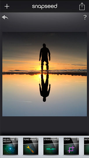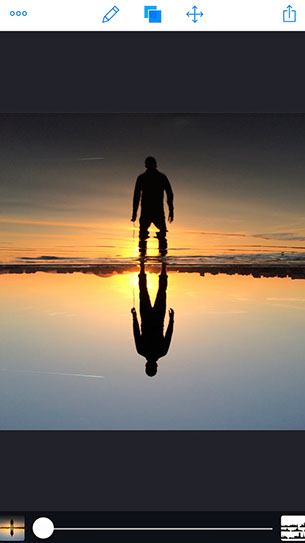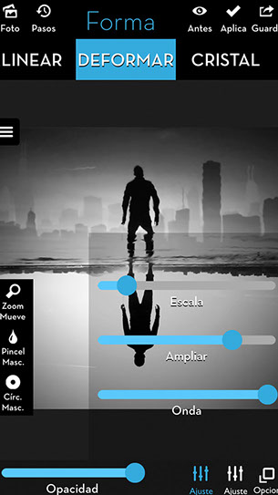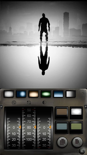 La paso a blanco y negro con la aplicación Noir. Para crear el efecto de ondas de agua sobre la parte de arriba de la foto, que es el reflejo real invertido, he utilizado la aplicación iColorama S, que nos da la opción de hacer el efecto ondas en la parte de la foto que nosotros queramos.