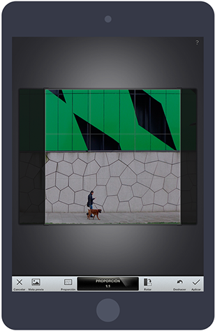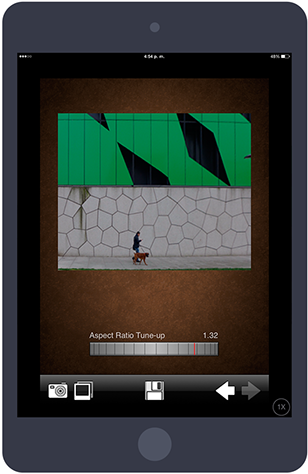 Ajustando en FrontView: Se trata de conseguir que todas las líneas horizontales y verticales de la realidad, se ajusten en la foto. Dicha corrección se ejecuta intentando cuadrar el rectángulo de la aplicación en los cuatro vértices, debiendo manipularlos hasta conseguir que queden todas las líneas de la foto perpendiculares entre sí. Luego, mediante la rueda de proporciones se tratará de aproximarse a la relación entre alto y ancho procurando no deformar las personas, o bien por excesivo alargamiento o encogimiento.