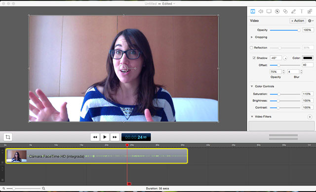 - Video: podremos jugar con el vídeo en cuanto a su orientación (ajustando por ejes X, Y y Z), tamaño y recortando (Cropping), así como añadir efectos como sombra (muy ajustable) y filtros (distorsiones, borrosos, efecto chroma… Más de 50 posibilidades), y ajustar la saturación, brillo y contraste. De este modo podremos corregir o editar el vídeo inicial si éste no ha quedado como queríamos en su toma o bien adaptarlo al entorno de nuestro proyecto, ya sea en primer plano o como pantalla insertada en otra imagen principal.