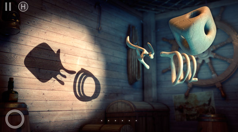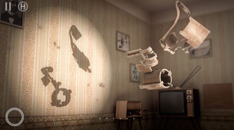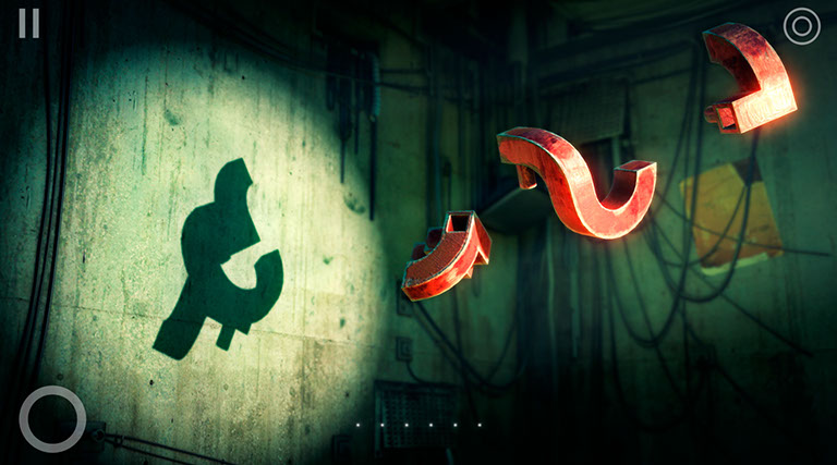 Las claves de este juego son por un lado los objetos 3D que giraremos y moveremos hasta descubrir una silueta. Estos objetos son abstractos y sin relación directa con la figura a descubrir. Por otra parte la sombra magníficamente lograda por el motor de render del juego, que proyecta ese objeto abstracto sobre una pared temática según la sección del juego en el que nos encontremos. Finalmente la interacción. La facilidad con la que moveremos el objeto 3D. Un dedo sobre él para girarlo, dos dedos sobre él para girarlo sobre su propio eje. Un botón en el lado opuesto inferior para cambiar de objeto cuando tenemos más de uno en pantalla, y mantener pulsado ese botón si queremos girar más de un objeto a la vez. Simple, sencillo pero con una respuesta tan bien realizada que parece que en todo momento estamos tocando ese objeto 3D.