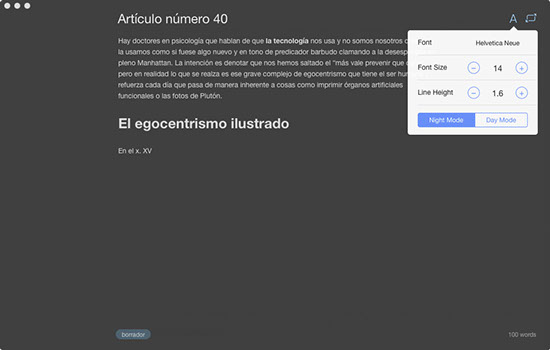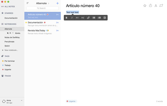 Se trata pues de una alternativa más sencilla, por lo que no encontraremos todas las características de Evernote a la hora de componer una nota, si bien nos bastará si buscamos escribir o guardar textos sencillos sin elementos multimedia. No obstante, la app ofrece una pequeña paleta que permite dar formato al texto (títulos, viñetas, negrita, etc.) al seleccionar texto, así como cambiar el tamaño del texto y el tema (blanco u oscuro). Al final de cada nota podemos añadir etiquetas que nos ayudarán tanto a clasificar como a encontrarlas. A éstas se les puede asignar un color desde la sección general, haciendo clic secundario para que se muestre el menú.