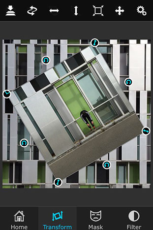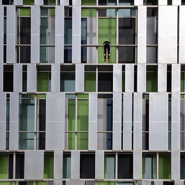 Para recortar y poner recta la fachada usó Tadaa. Para colocar la "personita" en el tercer piso utilizó SuperImpose. Lo que hizo fue colocar de "background" la fachada y de "foreground" el #tired_portrait. Lo recortó y manipuló hasta tenerlo cómo y dónde él quería.