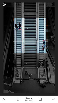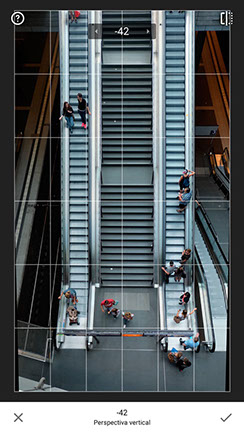 El primer paso a realizar es corregir la perspectiva, usando la app FrontView. Con Snapseed corrige la perspectiva vertical para que dé la sensación final que se ha realizado la imagen de forma cenital. También con Snapseed realiza el recorte de la imagen en su formato cuadrado para Instagram aunque hoy en día se puede realizar en otros formatos, ha preferido para esta fotografía el formato tradicional 1:1