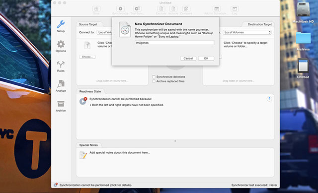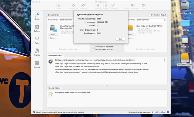 Todas ellas en ambos sentidos (es decir, en un sentido u otro a tenor de las unidades o ubicaciones que hayamos establecido). Así, la app nos permite programas copias de seguridad y sincronizaciones tanto de archivos como del disco entero, pudiendo realizar una clonación. Éste es el tipo de copia que realizamos con Time Machine, de modo que el programa crea una imagen (como un reflejo) que podemos instalar sobre el disco para tener una copia exacta de nuestra configuración y archivos. Así, ChronoSync tiene también esta opción, de modo que podemos configurarlo para crear esta imagen dando dos opciones: blind o mirror. Si optamos por blind se trata de copia estándar y realiza una imagen que es ejecutable desde la unidad en la que se ubica, sin que ésta interfiera en el resto de información que hay previamente dentro de la unidad (es decir, no la borra ni la formatea). Es la diferencia con respecto a la copia mirror (espejo), en la cual sí se formatea la unidad.