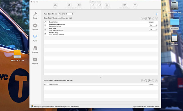 También podemos crear distintas reglas para sincronizar o realizar las copias de archivos y carpetas a distintos niveles: por nombre, fecha, tamaño, autor, creación, extensión, etiquetas, permisos o una combinación de alguna de ellas. Es decir, podemos crear una regla para que se sincronicen sólo los documentos creados por cierto usuario o los archivos de audio que ocupen hasta cierto volumen. Del mismo modo, podemos excluir la copia de determinados archivos. Pueden ser básicas (modo Simple), de modo que la app dispone de 5 tipos de reglas para que el usuario elija. En el caso de las opciones intermedia (Intermediate) y avanzada (Advanced) podemos crear desde cero la regla personalizándola en base a la combinación de doce elementos.