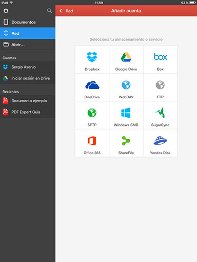 Las posibilidades de PDF Expert 5 no terminan aquí, ya que la aplicación ofrece un gran número de funciones adicionales. Además de lo visto hasta ahora, PDF Expert 5 cuenta con un potente gestor de archivos que te permitirá organizar todos tus documentos por carpetas, algo que muchos usuarios de iOS echan de menos en sus dispositivos. De esta forma, podrás llevar a cabo un gran número de acciones distintas sobre tus documentos, como copiar, mover, renombrar, borrar, crear archivos comprimidos o incluso fusionar documentos distintos. Además, también podrás añadir etiquetas de colores y marcar los documentos con una estrella para facilitar su localización posterior. Por último, resulta interesante la posibilidad de tener varios documentos abiertos a la vez, algo que no es posible en otras aplicaciones. Aprovechamos la ocasión para destacar que no solo es posible trabajar con documentos PDF: la app también permite abrir otros archivos, como documentos de texto, presentaciones, hojas de cálculo, imágenes, vídeo, audio o incluso archivos comprimidos (aun así, solo es posible editar los documentos en PDF). Otro de los pilares fundamentales de la aplicación es la posibilidad de acceder a nuestros documentos por FTP, WebDav, Dropbox, Google Drive, Box, SugarSync, Office 365 o OneDrive. De esta forma, tan pronto hayas introducido los datos de inicio de sesión de alguna de estas plataformas podrás consultar con comodidad los documentos que tienes almacenados en la nube. Y no solo eso, ya que PDF Expert 5 también permite escoger una carpeta en concreto y sincronizarla con la aplicación, de forma que todos los cambios que realices desde la app se sincronicen automáticamente con el servicio de almacenamiento en la nube que estés utilizando. Además, PDF Expert 5 cuenta también con compatibilidad con iCloud.