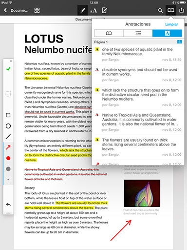 Si nos centramos en las posibilidades que ofrece PDF Expert 5, estamos ante una aplicación que nos permite llevar a cabo un gran número de tareas distintas. La característica principal por la que destaca la app es la sencillez con la que nos permite editar los documentos PDF. Para ello, PDF Expert 5 ofrece una serie de completas herramientas con las que podrás dibujar, subrayar, añadir texto, incluir notas, aplicar sellos e incluso firmar los documentos. A pesar de la cantidad de herramientas disponibles, es importante recalcar la sencillez de uso de la app. Por ejemplo, si lo que quieres es utilizar la herramienta de subrayado, solamente tendrás que seleccionarla y deslizar el dedo sobre el texto a destacar. En caso de que quieras añadir texto, el proceso es igual de sencillo. Solo deberás seleccionar la herramienta adecuada de la barra de herramientas y pulsar sobre un lugar libre en el documento para empezar a escribir. Además, podrás cambiar tanto la fuente como el tamaño de letra o el color. Sin duda, una de las características más llamativas de esta herramienta es la capacidad de detectar que nos estamos quedando sin espacio para escribir y saltar a la siguiente línea para que el texto no se solape con la información del PDF original. PDF Expert 5 cuenta también con otras herramientas interesantes, como una para dibujar sobre el documento que resulta bastante útil para marcar o rodear las zonas más importantes del contenido. Además, podremos escoger el color que queramos utilizar, así como la transparencia o el grosor del trazo.