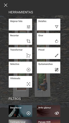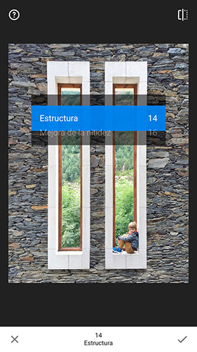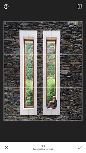Lo primero que le haría sería abrir el Snapseed y recortarle el suelo, así conseguiría una sensación de mayor escala, ya que el que vea la foto no sabe a cuanta distancia se encuentra el niño del suelo. Después la pondría recta con la nueva orden “Transformar”, modificando la perspectiva vertical.