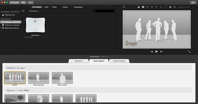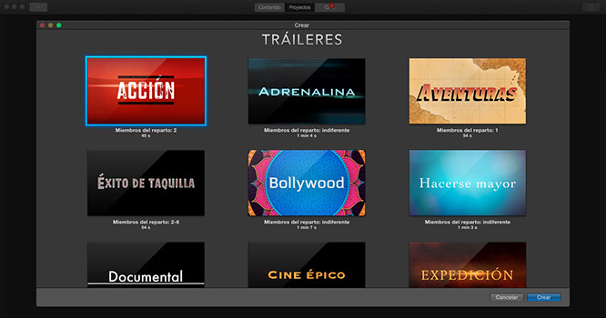 Por otro lado, iMovie nos permite crear en unos pocos minutos lo que Apple llama “trailers de cine”: pequeños montajes de vídeo con música y títulos que nada tienen que envidiar a los trailers de películas que estamos acostumbrados a ver. Esta es una opción muy interesante cuando apenas tienes tiempo de editar vídeos familiares o de amigos. En unos pocos minutos puedes crear un vídeo de menos de 5 minutos con lo más destacado de aquel viaje, de aquella fiesta de cumpleaños o de aquella cena y luego compartirlo con quien quieras. Te aseguro que, de todos los montajes que hagas, los trailers con tus vídeos personales serán los que más veas con el paso de los años.