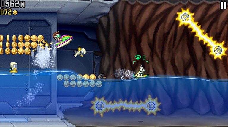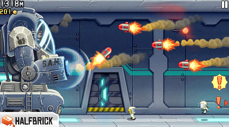Para quienes no lo conozcan, Jetpack Joyride es un juego sin final, lo que le llaman un endless runner, un título de scroll horizontal 2D en el que vamos sorteando obstáculos, que se generan aleatoriamente lo que hace que cada partida que juegues sea distinta, y donde tendrás que intentar llegar lo más lejos posible. La distancia que alcance será tu récord, y tu reto, muy simple, superarlo. Sí, la tienda está llena de títulos similares, de planteamiento similar, pero este clásico, lanzado ya en 2011 por parte de Halfbrick, los creadores de Fruit Ninja, ha alcanzado el grado supremo, lo han dotado de un afinamiento y cuidado especial, en todos sus detalles. La animación, la ambientación, sonidos, música, y sobre todo, la respuesta al único control que se necesita, pulsas y activas el propulsor, sueltas y deja de responder y bajas... Tan simple, tan difícil, está tan bien realizado que parece no existir el famoso lag o tiempo de respuesta. Este pequeño detalle, esa respuesta precisa y exacta dota al título de una jugabilidad no tan común en el resto de juegos de otras compañías. Si a ello unimos que la transición por los menús es ágil y rápida, multiplican el nivel de vicio a cuotas dañinas para tu vida social.