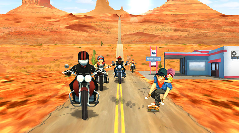 ¿Cómo se traslada todo esto a un juego? Pues con una combinación de “Guitar Hero” y “Temple Run” bien original y que no te dejará indiferente. Simplemente controlaremos a ambos jóvenes mientras se desplazan hacia nosotros sobre un monopatín y podremos movernos hacia los lados, saltar y tocar las notas y acordes que al son de la música van apareciendo en pantalla, todo ello sin olvidarnos de recoger el polvo de estrellas y los extras que van apareciendo. En función de nuestra habilidad y rapidez de reflejos obtendremos un rango y puntuación al final de cada sueño.