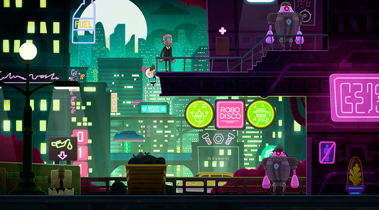 El detalle de los escenarios, los elementos, personajes, enemigos, animaciones está realizado con un gusto exquisito que ya me cautivó en Tiny Thief. Esos detalles se manifiestan en guiños hacia otros juegos, la mayoría móviles, referencias que te robarán al menos una sonrisa y que harán que quieras buscar hasta el último recoveco por encontrar esos objetos ocultos a modo de recompensas. Esos objetos ocultos son momentos que desbloquearán pequeñas animaciones donde se muestran cómo llegaron a la vida de nuestra pareja de protagonistas.