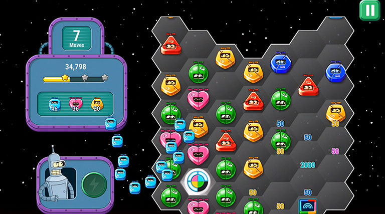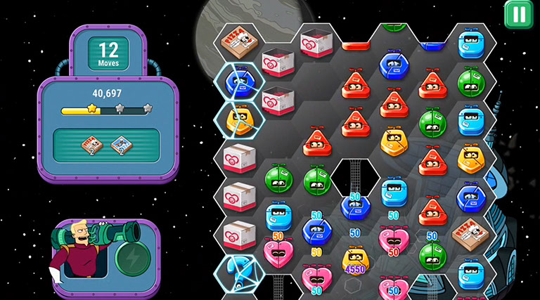 ¿Entonces? ¿Por qué recomiendo Futurama Game of Drones? Bueno, pues porque han innovado y en vez de hacer tres en línea, ¡tienes que hacer cuatro fichas en línea para avanzar! Ya, ya, ya, es broma. Por supuesto que no es por eso. Los dos equipos que han desarrollado este juego han hecho un trabajo excelente. Y déjame decirte que no era nada fácil el reto. Han cogido una franquicia, Futurama, con miles y miles de seguidores fieles, que añoran aquellas primeras temporadas originales, que echan en falta las aventuras de Blender y Fry y han creado un juego alrededor de una de las mecánicas más trilladas de nuestro tiempo, la del Candy Crush. Sí, aquí se trata de destruir drones y repartir pizzas juntando un mínimo de cuatro fichas iguales para generar reacciones en cadena y superar cada una de las pantallas. Pero no lo han hecho con la intención de vender un juego pensando que la propia imagen de la serie vendería por ellos. Se han desarrollado un juego en condiciones. Con un modelo de distribución gratuito del título, lo que no te deja excusa para no descargarlo, puedes ir avanzando y, cuando pierdas todas tus vidas, como en otros juegos, tendrás la opción de ver vídeos, esperar o gastarte tu dinero si la impaciencia te come. Pero a diferencia de otros juegos, los niveles están muy bien pensados. Jugar no es tan aleatorio como parece y requiere de estrategia si no quieres gastar las ayudas o recurrir a la compra de vidas y extras.