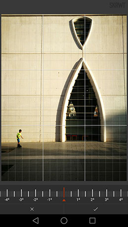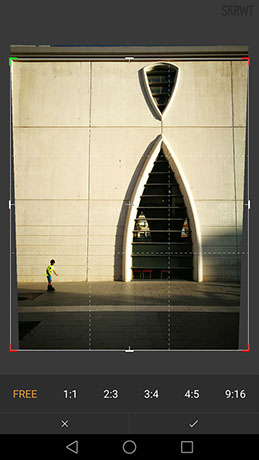A continuación, vamos a seleccionar la fotografía y nos iremos a la opción de modificar la perspectiva vertical. Del mismo modo, también podremos enderezar la fotografía para fijar el suelo recto y recortarla según las zonas que nos interesa. Lógicamente, vamos a quedarnos con la imagen completa de la fachada y recortarla también por la parte de abajo. La app nos deja recortar de una manera libre o directamente con varios formatos, como puede ser el formato cuadrado ó 1:1, el más generalizado en Instagram.