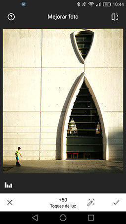 Hay veces que la imagen no queda suficientemente definitiva y la mejora de la nitidez nos va a ayudar bastante a ello. En este caso aumentaremos a +26 y guardamos la acción (siempre aconsejo no superar los 30). Nos vamos, dentro de Snapseed, a la opción Mejorar la foto. Aquí nos encontramos con amplias opciones de mejorar el brillo, contraste, saturación...etc. En este caso concreto, quiero iluminar la imagen y lo hago con “Toques de luz” para que la fachada no esté tan apagada y mantengo las sombras (6). Aumento el contraste en la imagen hasta +32 (7) y guardamos todo.