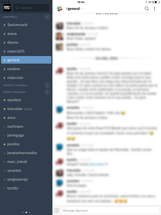 Uno de los aspectos a tener en cuenta en una app para un número grande y sobre todo variado de personas es que va a haber varias plataformas y muchos dispositivos, probablemente varios por persona. Es decir: los primeros requisitos serán la multiplataforma y el multidispositivo, y con eso ya hacemos una primera criba. Slack tiene apps para Android, iOS y otros sistemas, además de la posibilidad de iniciar sesión desde el navegador sin instalación.